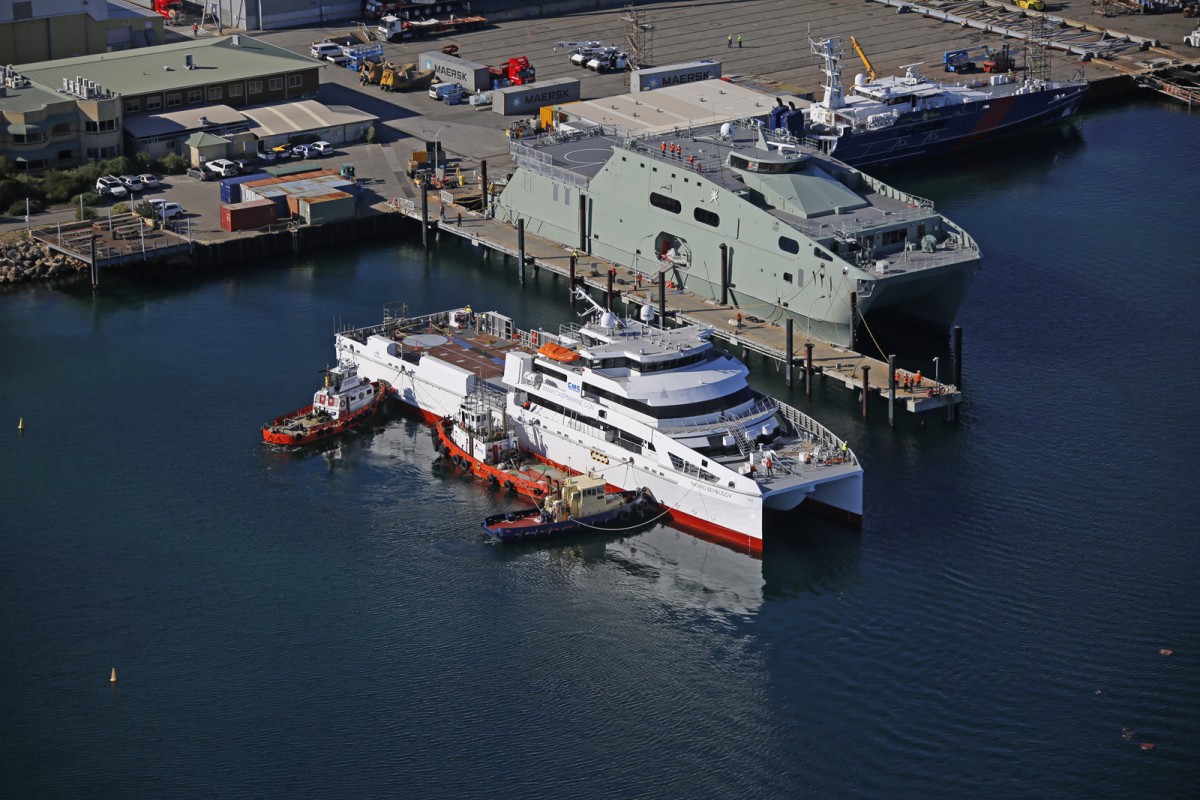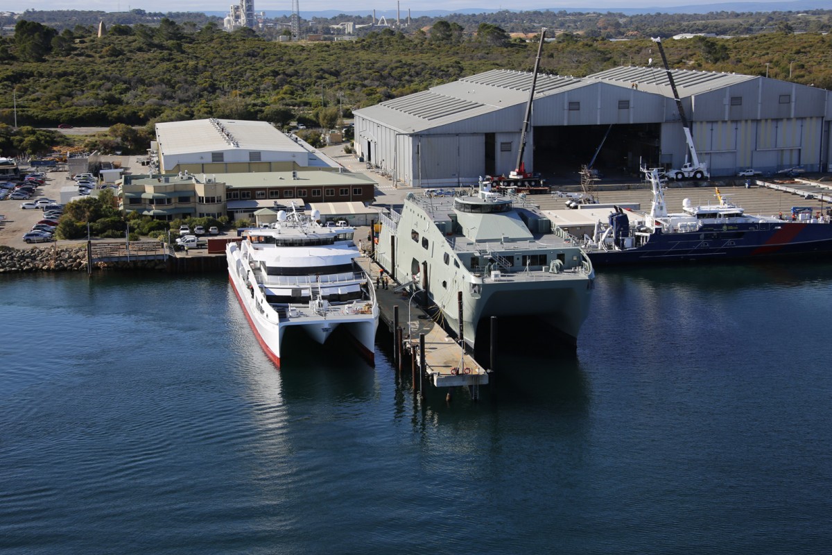 Austal Large Crew Transfer 70 (Hull 392) maneuvering alongside at Austal Australia (with Royal Navy of Oman’s High Speed Support Vessel AL NAASIR (S12) and the Australian Border Force’s Cape Wessell patrol boat in the background).